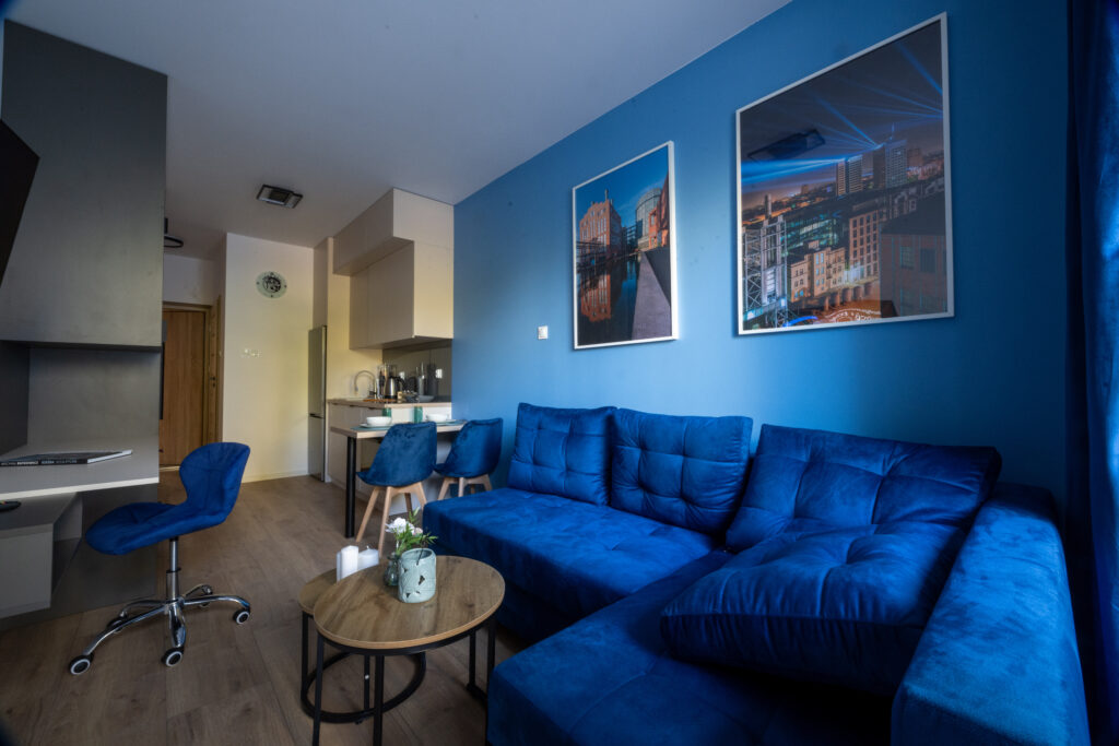 Przedstawiamy Państwu lokal inwestycyjny o łącznej powierzchni 44 m², składający się z dwóch niezależnych kawalerek. Każde mieszkanie o powierzchni 20,1 m² posiada własną łazienkę oraz w pełni wyposażoną kuchnię. Kawalerki zostały zaprojektowane w taki sposób, aby na niewielkiej przestrzeni zmieścić strefę wypoczynkową z wygodną sofą, stolikami kawowymi oraz telewizorem smart. Każda z nich oferuje także przestrzeń do pracy, wyposażoną w szerokie biurko z wcięciem w szafie, oraz część kuchenną z szerokim blatem i dwuosobowym stołem. Oba mieszkania współdzielą przedsionek, w którym znajduje się szafa gospodarcza na wspólny sprzęt. Do każdego z mieszkań przynależy także osobny balkon.